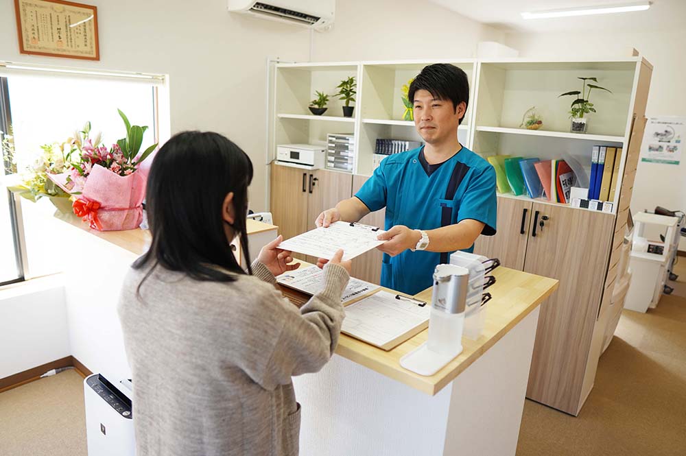 当院にご来院いただけましたら、受付にて問診表をお渡しします。 お身体の状態をできるだけ詳しくご記入をお願いします。