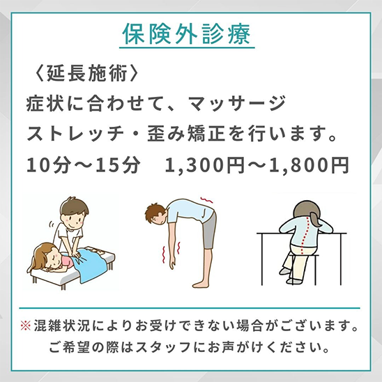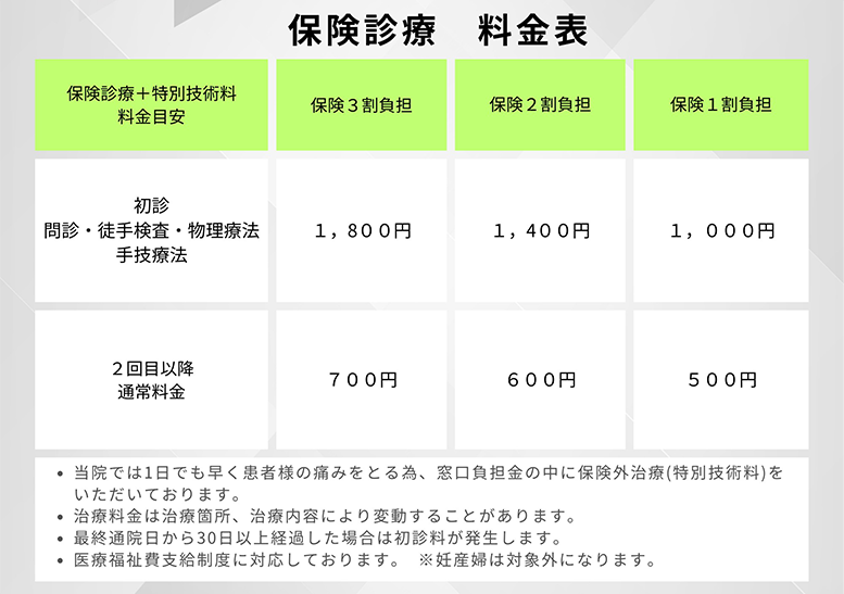 ・当院では1日でも早く患者様の痛みをとる為、窓口負担金の中に保険外治療(特別技術料)をいただいております。