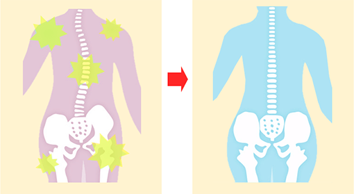 全身の歪んでいる骨格を正しい位置に調整することで猫背や反り腰などの姿勢を改善していきます。また姿勢不良からくる肩こり、腰痛などの慢性痛を改善することができます。